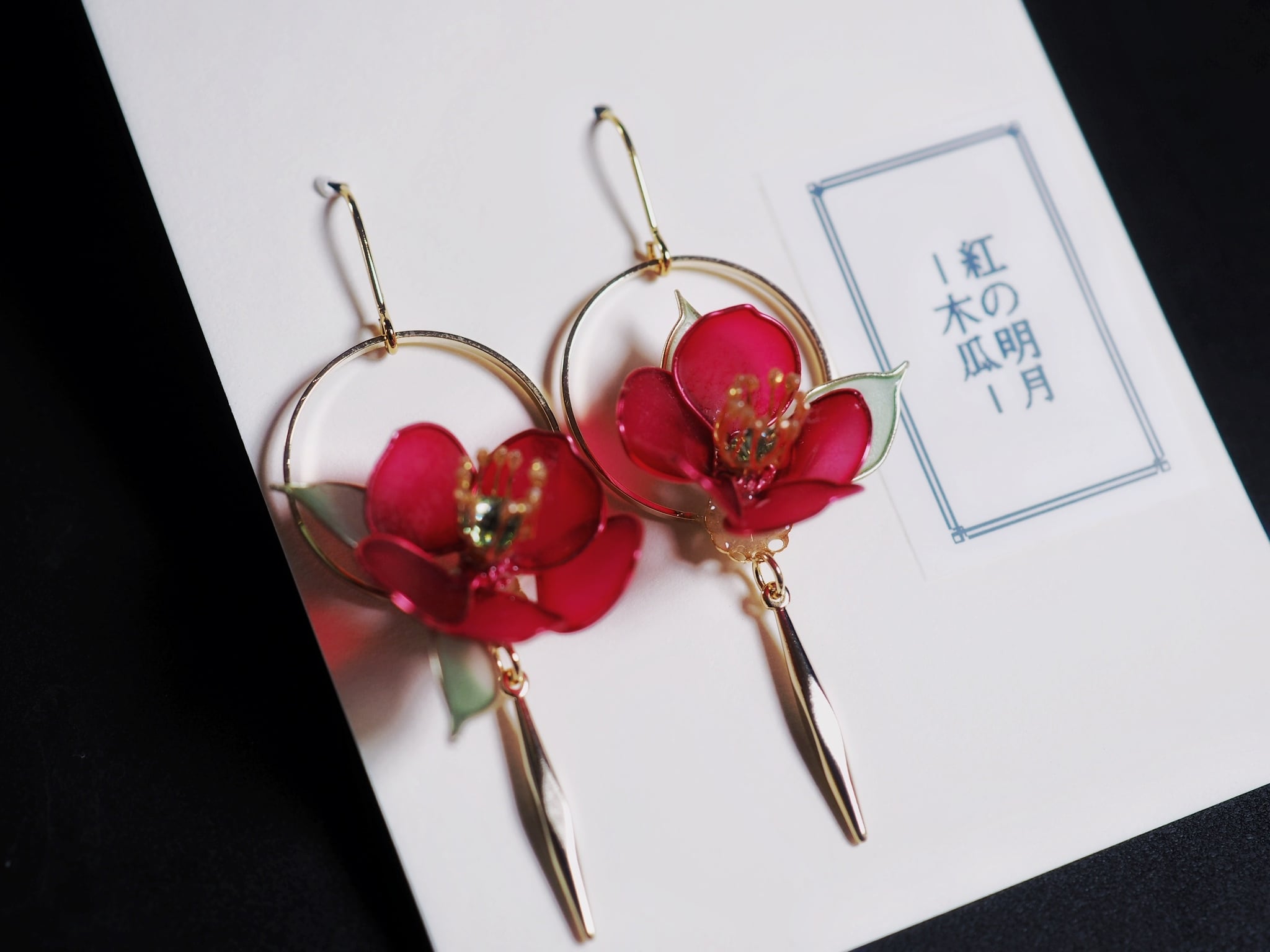月をイメージしたまるいパーツを合わせて満月の下に明るく紅色に咲く