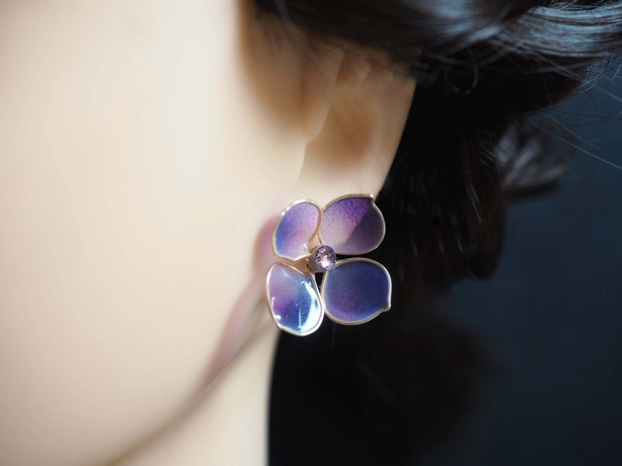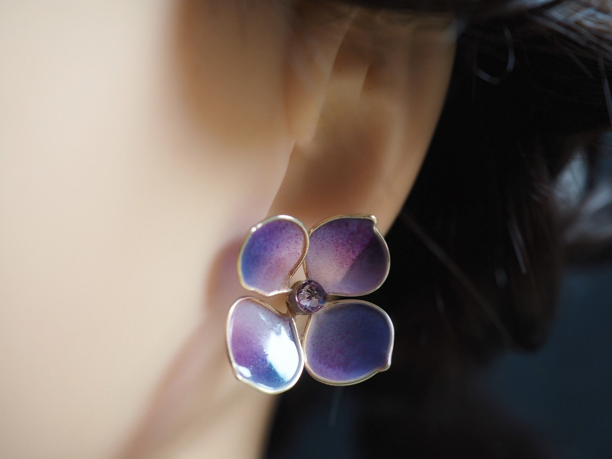 本物の花びらのような白に淡く赤みを帯びる紫の彩りに、より儚さや静けさが加わればと、シンプルなひとつぶタイプの耳飾りとして仕立てました。