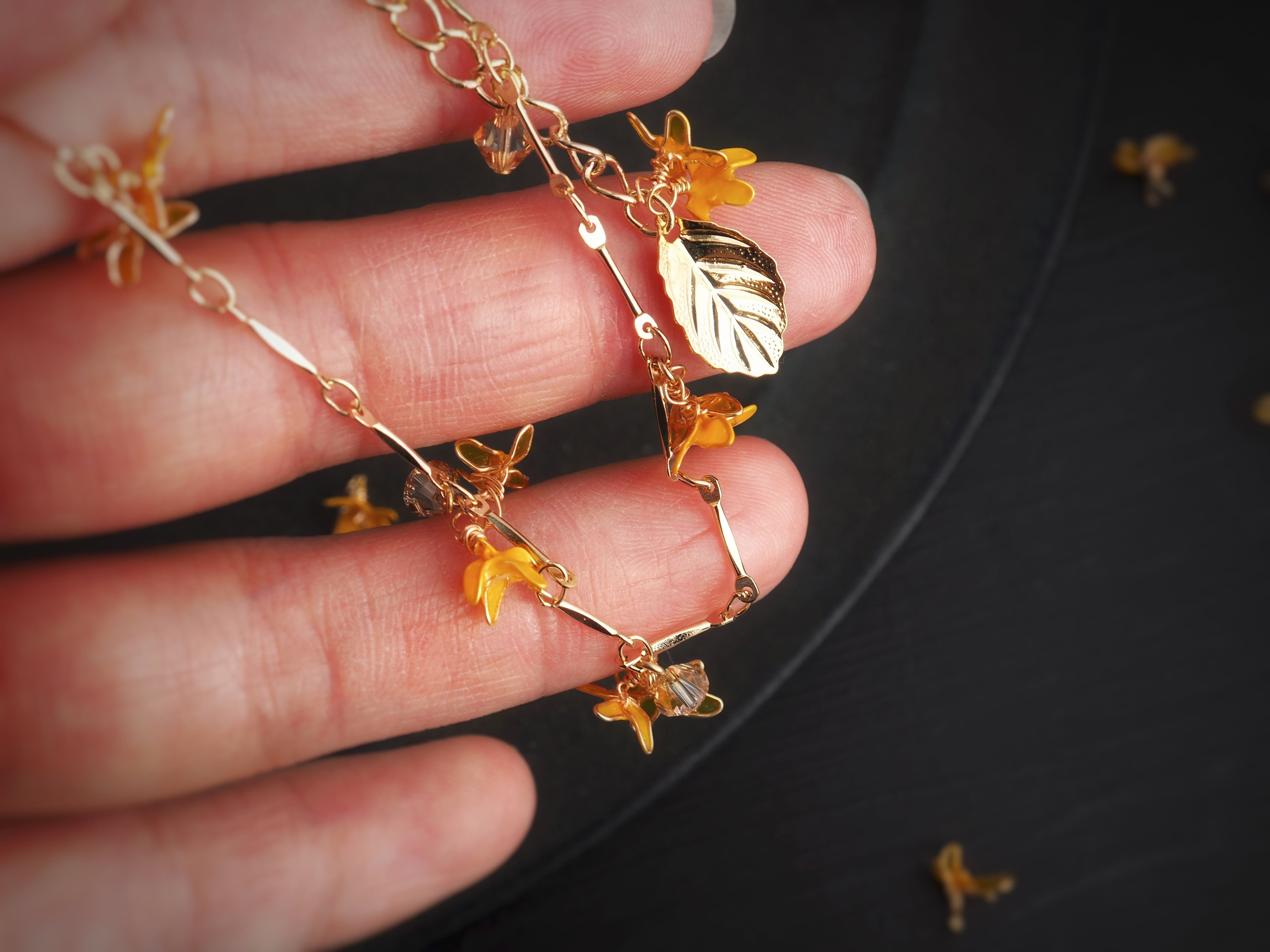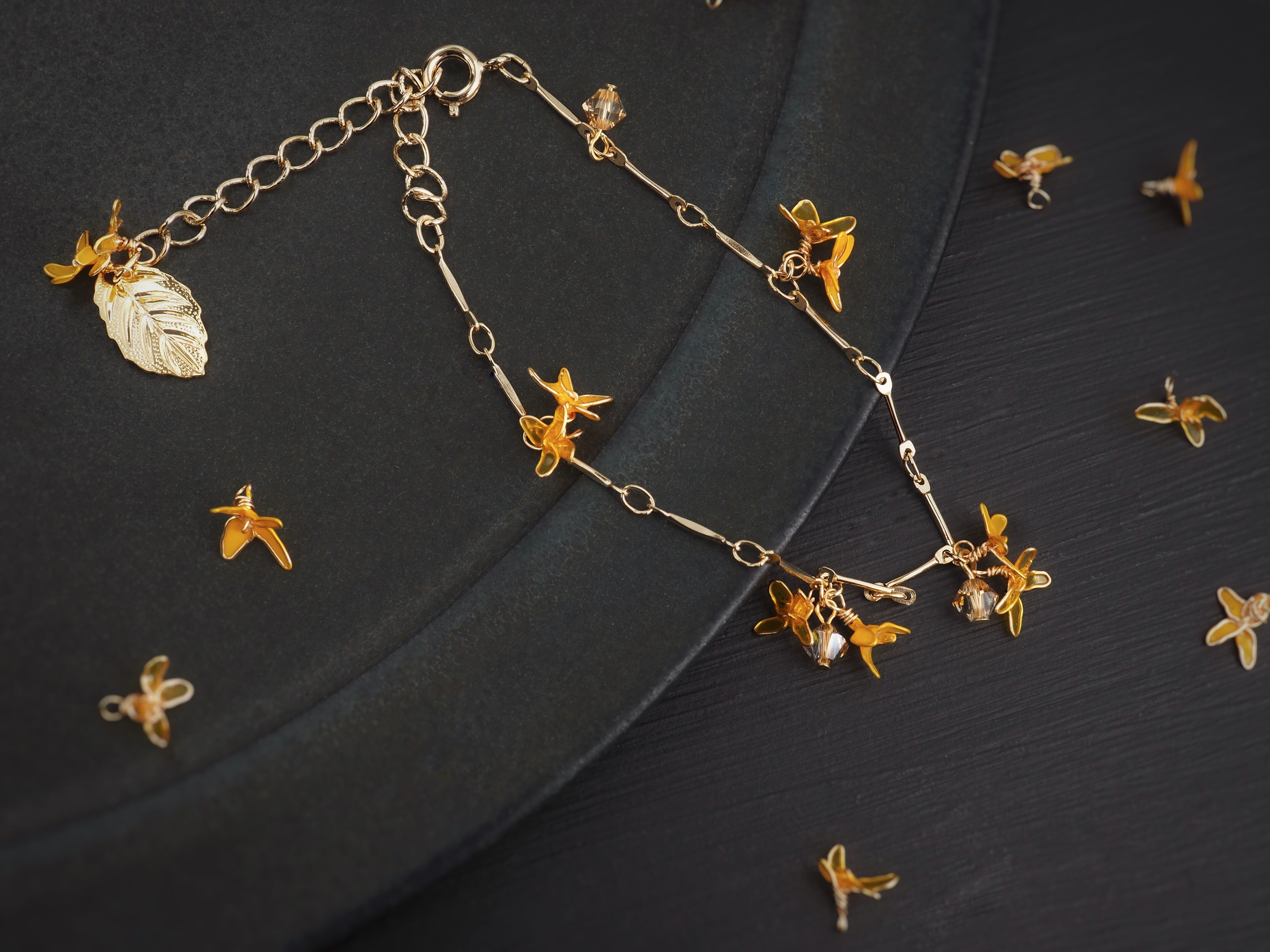 一点一点、表情の異なる花びらたちが手元で輝く秋色のブレスレットです
